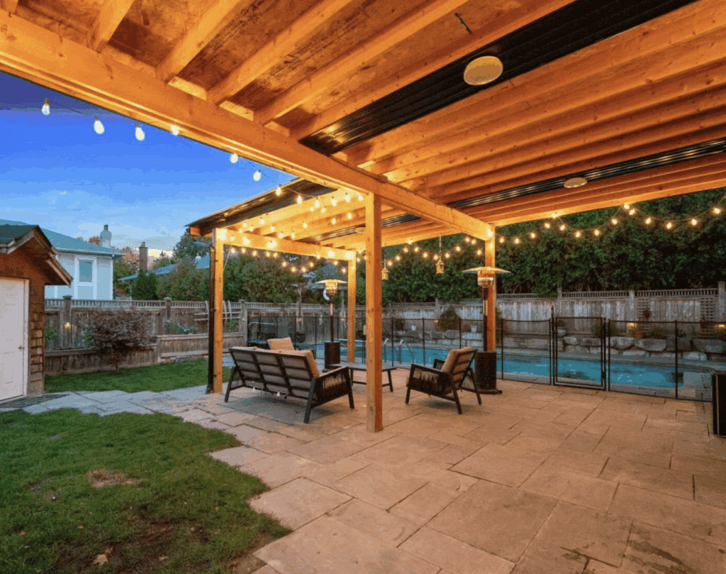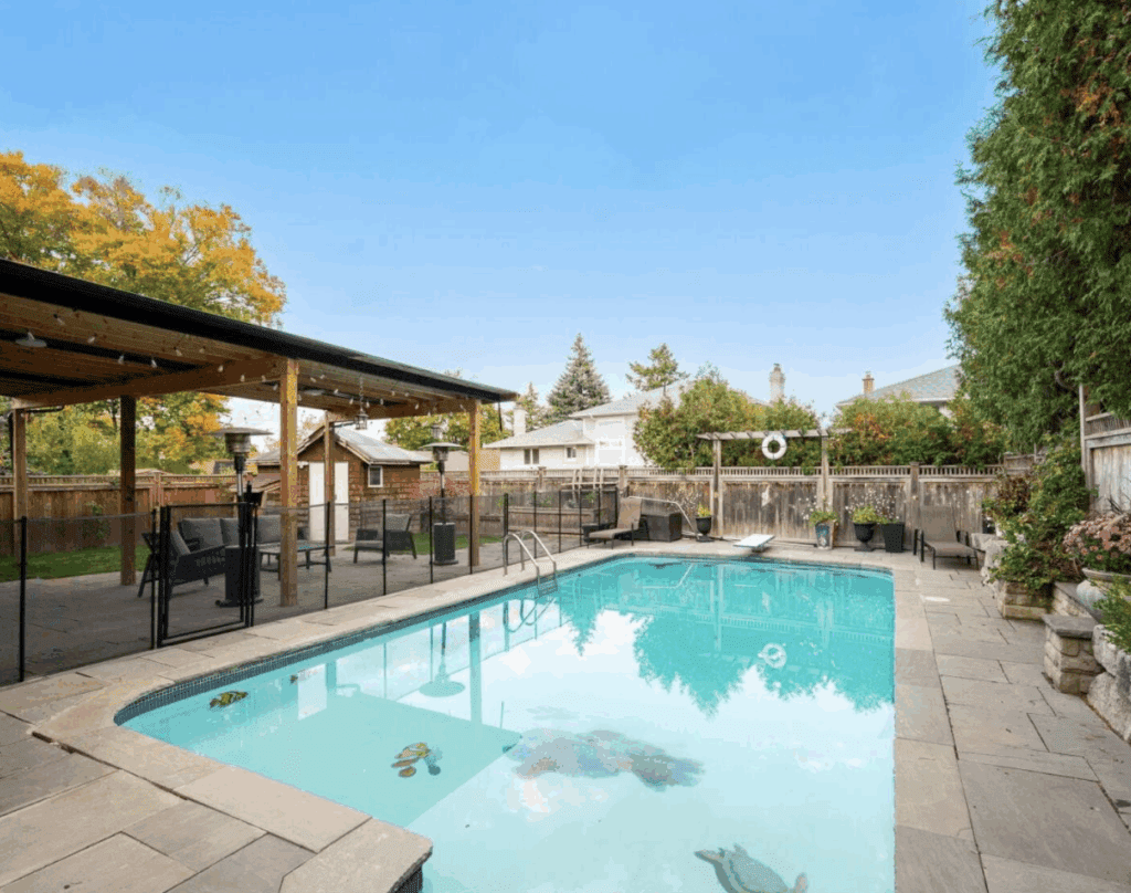 Situated on a beautiful 58 x 117 ft lot, the property showcases an incredible backyard oasis featuring a custom concrete pool with mosaic insets, mature landscaping, and generous entertaining areas—ideal for summer gatherings or peaceful relaxation.