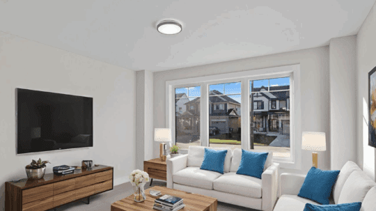 Step inside to an inviting open-concept main floor, featuring a bright living area with large windows that fill the space with natural light. The contemporary kitchen offers generous counter space, a central island for casual dining, sleek cabinetry, and a walk-in pantry for added storage. The adjoining dining area opens directly to the private concrete patio — an ideal setting for morning coffee or evening entertaining.